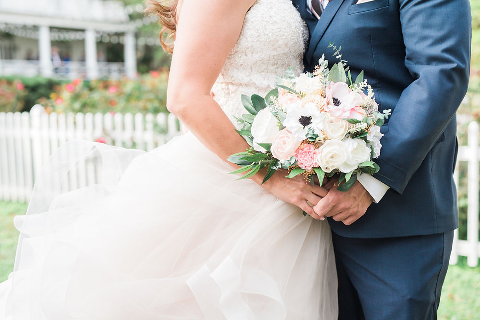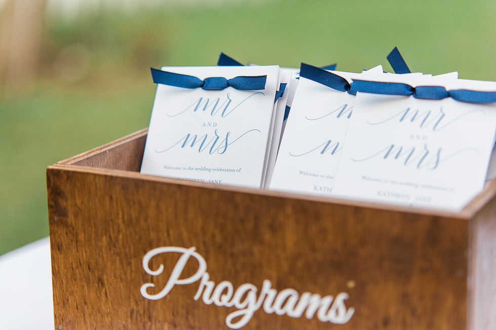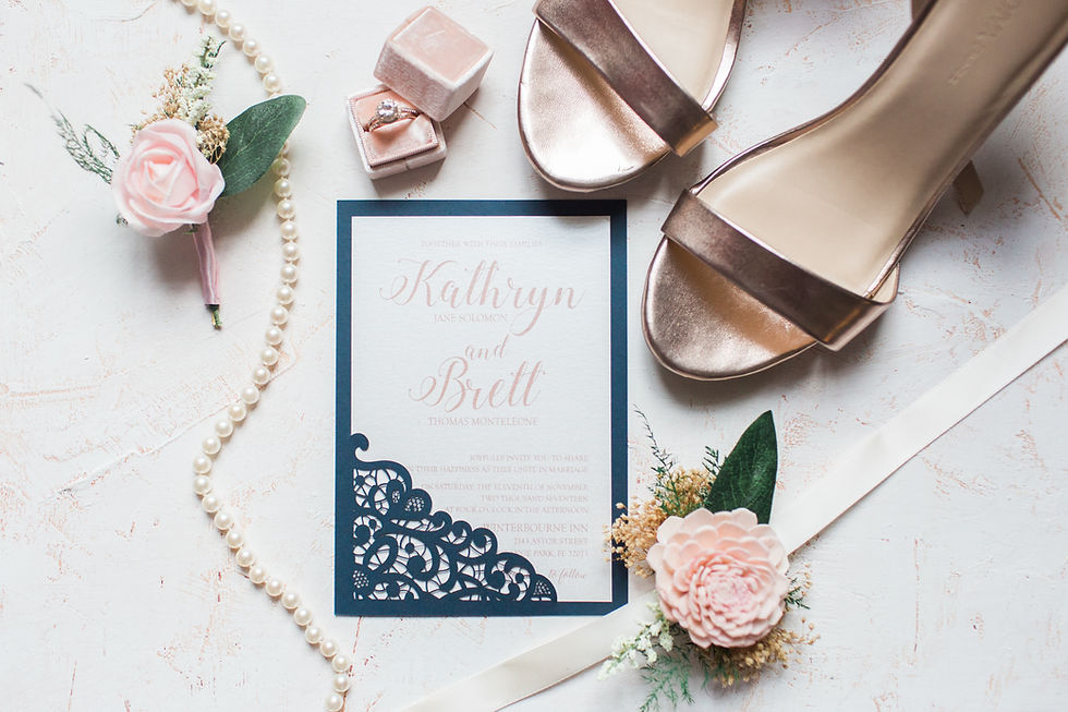 Today on the blog we have a beautiful wedding to share! Brett and Katie chose a gorgeous venue that is right on the river and has a huge lawn that is fenced in with huge trees everywhere. Talk about super romantic photo backdrops! The inn is a picture perfect white house with just a touch of vintage and mixed with a cozy intimate feel. If you want a backyard wedding feel, but just a notch more romantic this is your place! Not only were we already in love with the venue, but Brett and Katie's wedding colors were rose gold, blush and navy. If you know us, you might know we are partial to this color scheme! Blush toned details always photograph so beautifully and create the most romantic feel. We have all the heart eyes for their invitation sweet, and all her girly details. Lets not forget about her dress! Big, poofy and blush? Yes please!